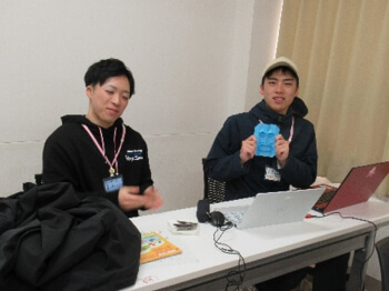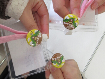 学生スタッフによる名札作りの説明 -