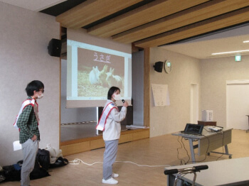 12月3日(水)、小県郡長和町にある「樅の木福祉会」(障害児・者支援の複合的事業所)で「私のみらい選択・暮らし編」第2弾を実施しました。本学学生、教員等合わせて11名、同事業所の障害当事者19名や関係の職員と計40名程度、2時間のワークショップとなりました。本日の「問いと選択」は、①『動物になるとしたら「うさぎ、イルカ、わし」のうち、3つの話しを聞いて、どれになりたいと思いましたか?』 ②『冬の代表的なイベントとして「クリスマス、正月、節分」の3つがありますが、3つの話を聞いて、どれが一番楽しそうに感じましたか?』