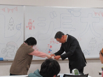 午前10時、本学学長の挨拶から始まり、午前中は「最初の出会いプログラム」の中で、受講者と学生スタッフとのコミュニケーションゲームを楽しみました。