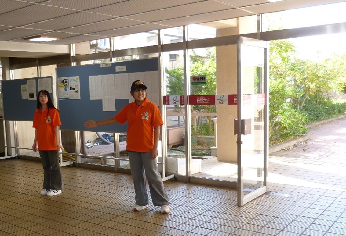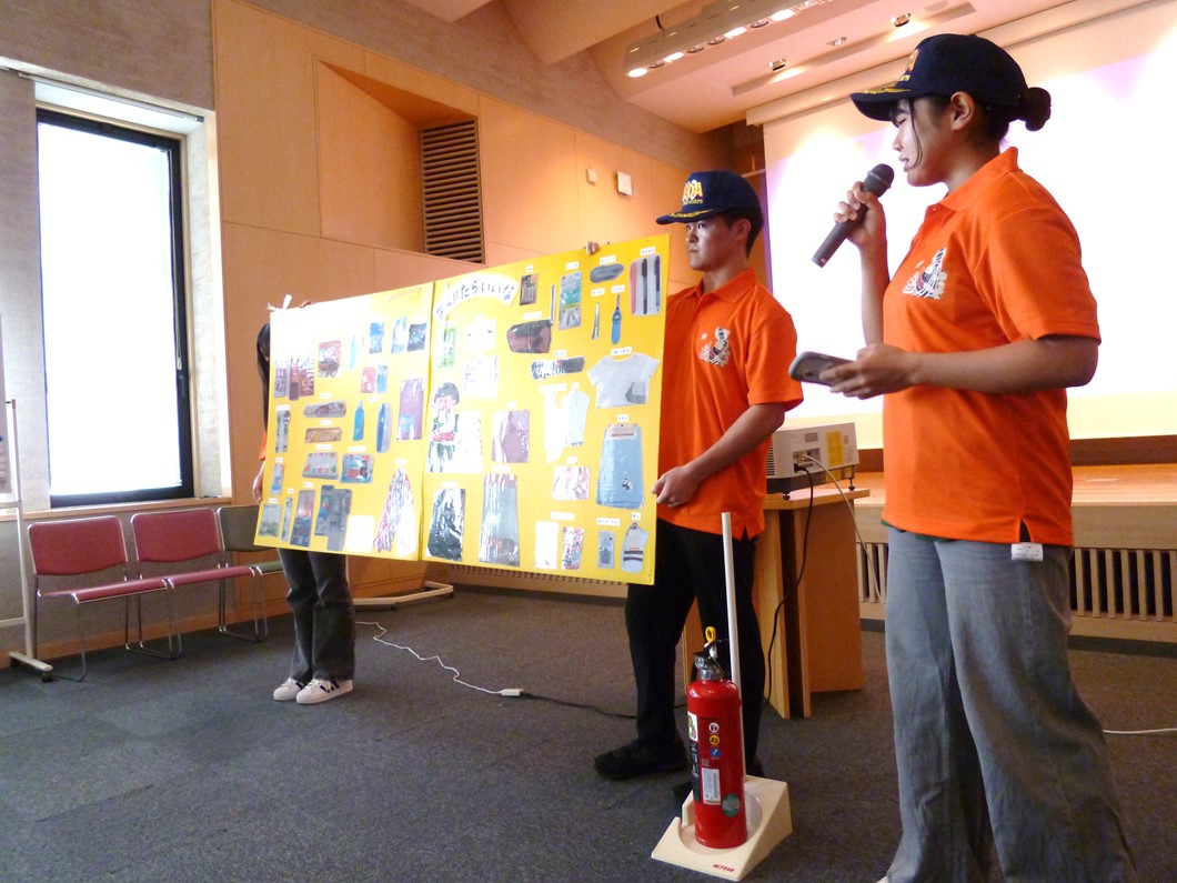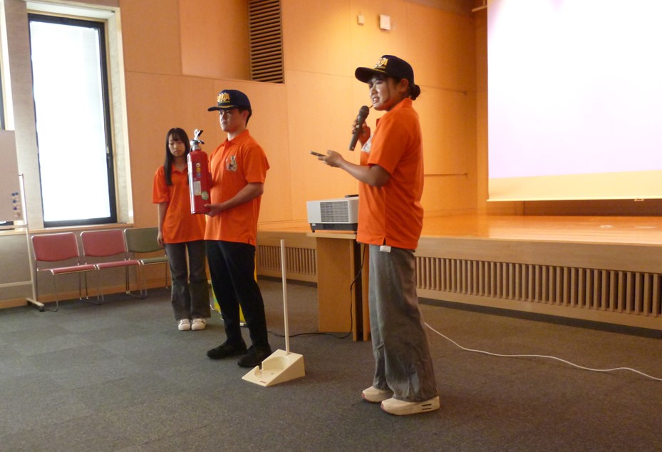 学生消防サークルから、大橋美優さん、荒井大輝さん(社会福祉学部3年)、井川ひなたさん(環境ツーリズム学部2年)が、教職員に向けて啓発研修を行いました。