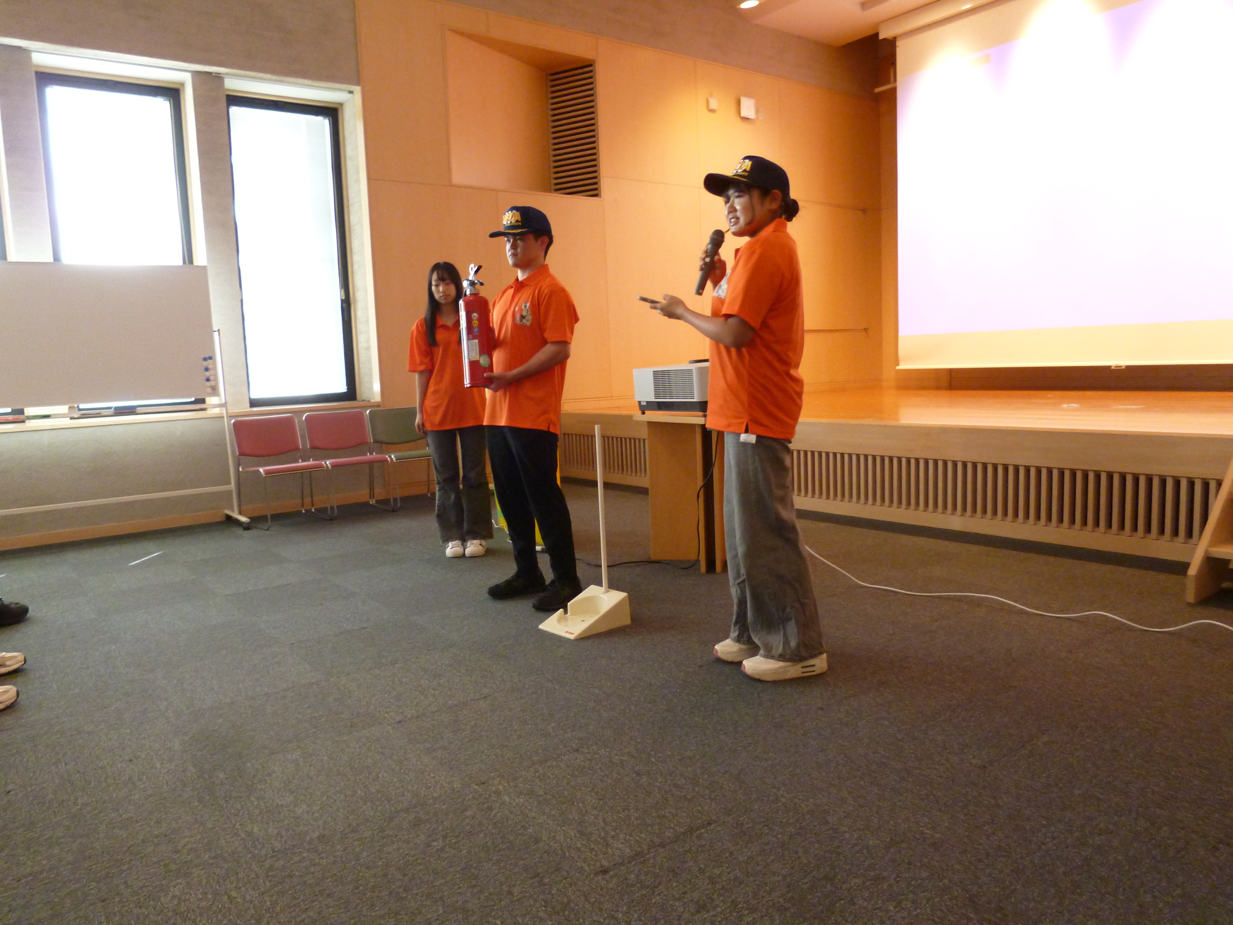 学生消防サークルから、大橋美優さん、荒井大輝さん(社会福祉学部3年)、井川ひなたさん(環境ツーリズム学部2年)が、教職員に向けて啓発研修を行いました。