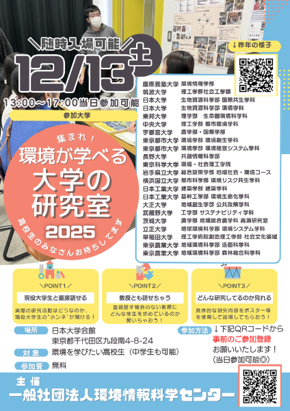 2025年12月13日(土)に環境を学べる首都圏の18大学の研究室が日本大学会館に集まり、高校生の皆さん向けの展示・説明会を開催します。