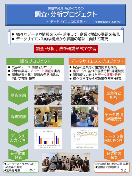 企業情報学部の高橋雅夫ゼミでは、「課題の発見・解決のための調査・分析」をテーマに、様々なデータや情報を入手・活用して、企業などの視点に立って地域の課題を発見・抽出するとともに、データサイエンス的な視点からそれらの課題の解決に向けた研究をプロジェクト形式で進めています。
