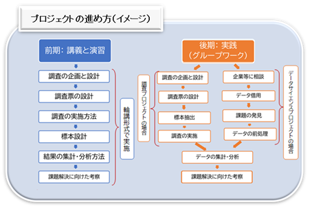 後期のゼミ活動では、2つのコースを設けています。1つは、アンケート調査を企画・設計・実施してその結果を基に地域や企業の課題を抽出し、解決に向けて考察するコースです。このコースのプロジェクトを「調査プロジェクト」と呼んでいます。また、2つめのコースは、地域の企業や自治体などと連携して、例えば営業関係のデータなど実際のデータの貸与を受けて分析し、企業等の課題解決に取り組むコースです。これを「データサイエンスプロジェクト」と呼んでいます。
