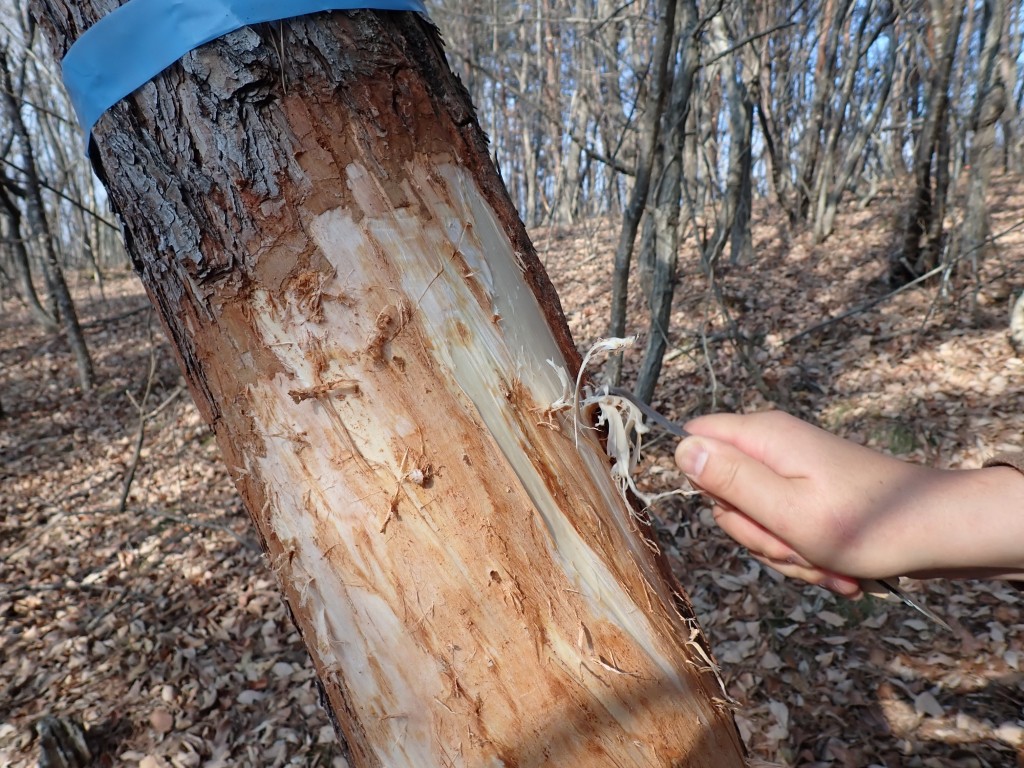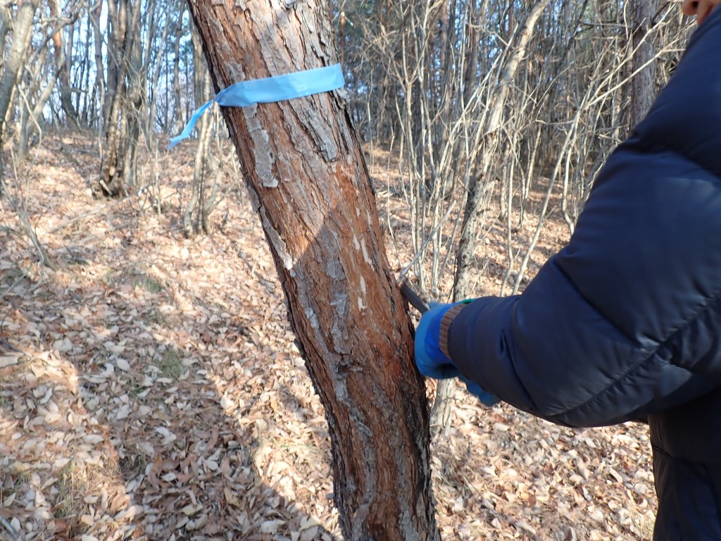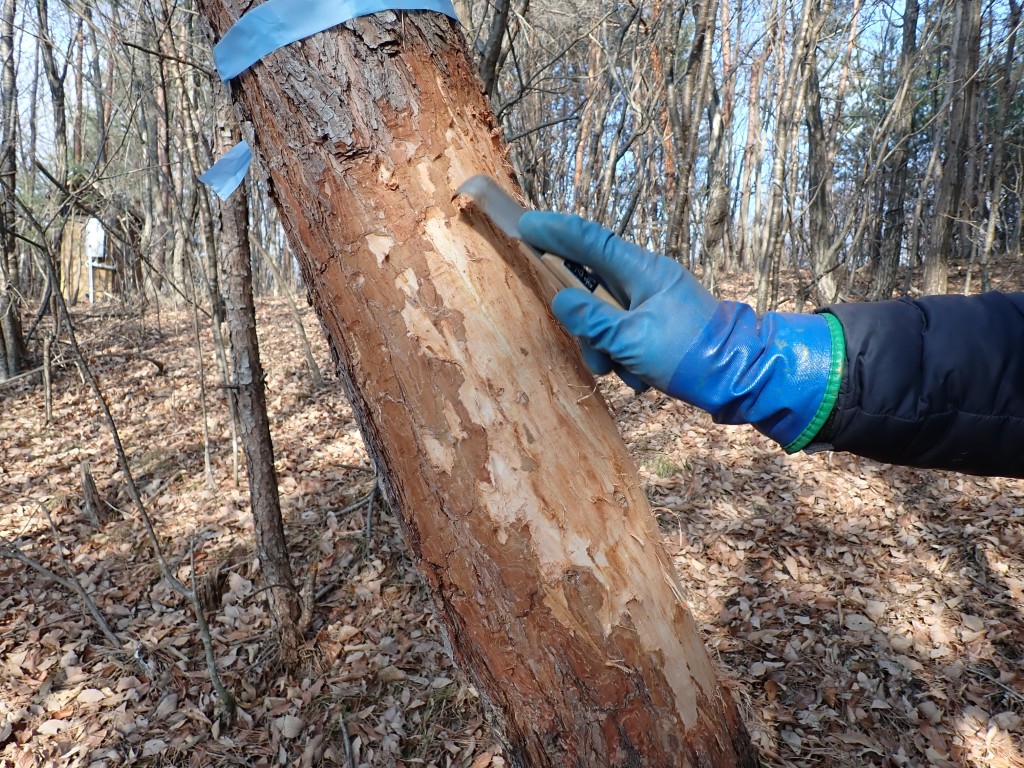 アカマツの樹皮を採取する様子