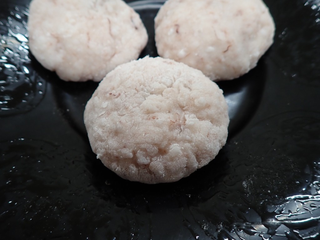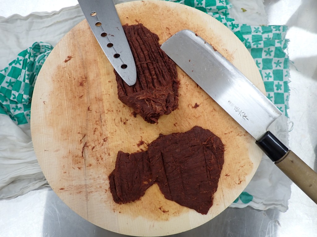 完成した松皮餅(アカマツ樹皮の混入により、全体が赤みを帯びている)