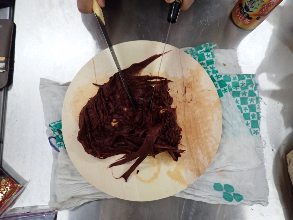 煮たアカマツの樹皮を包丁の背で叩いて繊維をほぐす工程