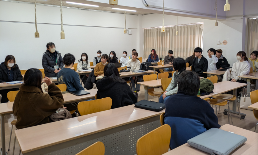 2026年1月14日(水)に行われた「人間と社会の理解」の片山クラスの授業で10月から2026年1月までの半期の期間、学生たちが興味のある分野のグループに分かれて、訪問インタビュー等を実施したことについて、発表しました。