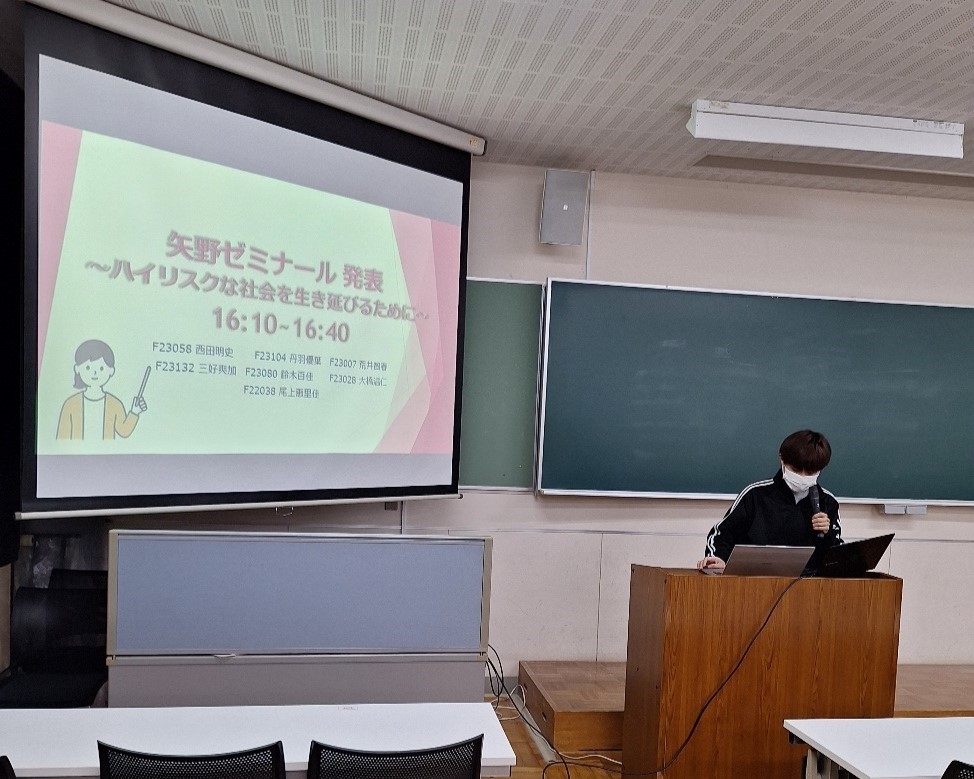 矢野亮ゼミナールは、「ゼミナール報告×地域福祉×貧困×金融」というテーマで報告しました。「ハイリスクな社会を生き延びるために」というコンセプトのもと、各学生が個人研究を報告しました。「貧困のリスク要因となる日本の金融教育の遅れについての考察」、「地方と都市における人口減少の実態と地域格差」、「地域のつながりの希薄化を改善するために」、「セーフティネットとしての学校給食の福祉的意義」、「過疎地域における地域づくりの方針に関する研究-『活性化』と『むらおさめ』の比較から」、「貧困女性に対するセーフティネットの在り方の考察」、「自治体間における貧困支援格差の要因分析-上田市と他5市の比較研究」の各テーマでの報告が行われました。