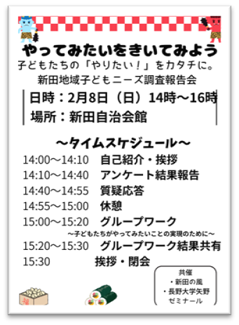 昨年度に「NPO法人新田の風」が実施した、新田地域における子どもニーズ調査について、矢野ゼミナールで調査データの集計と分析等を行ないました。