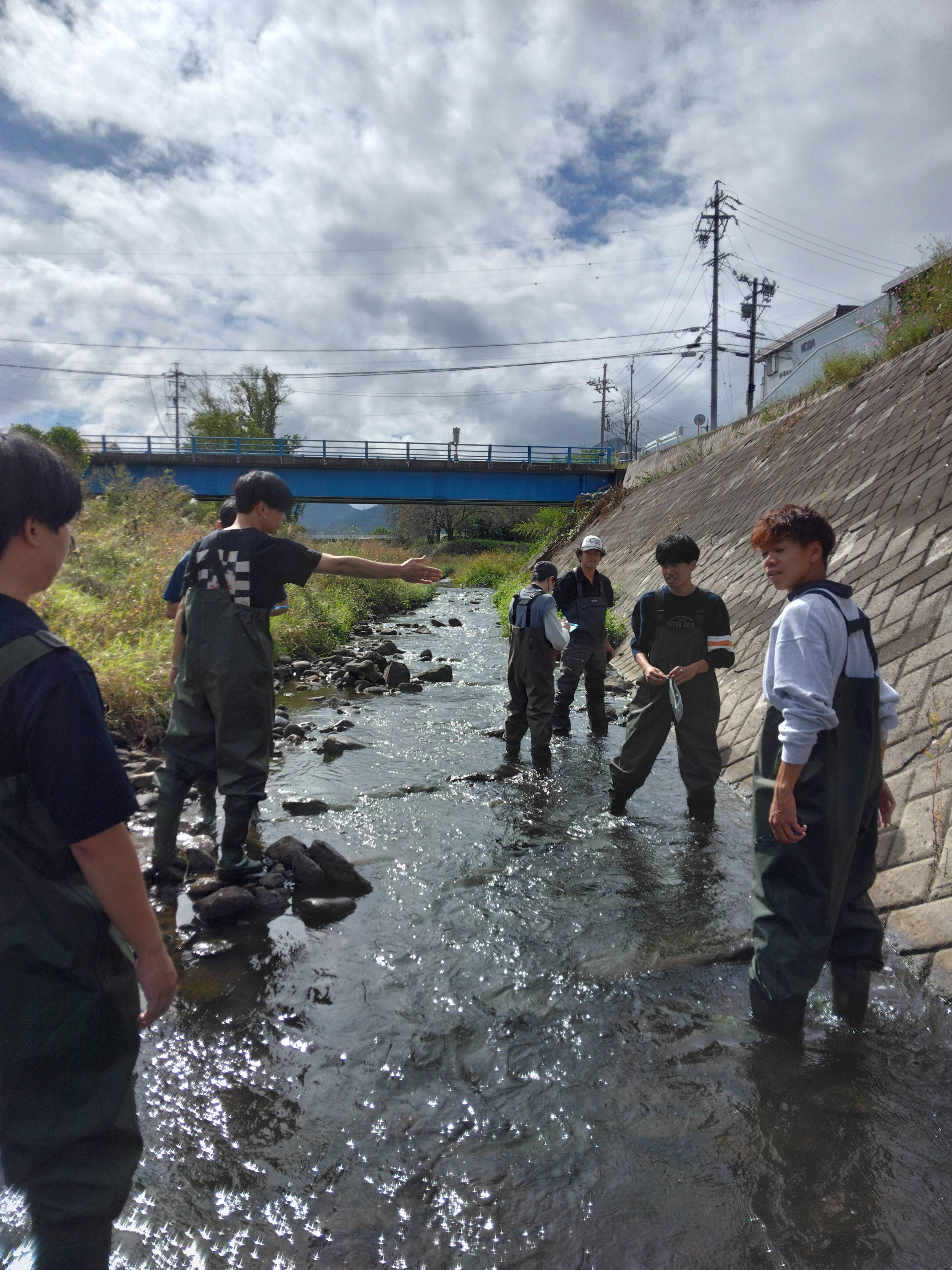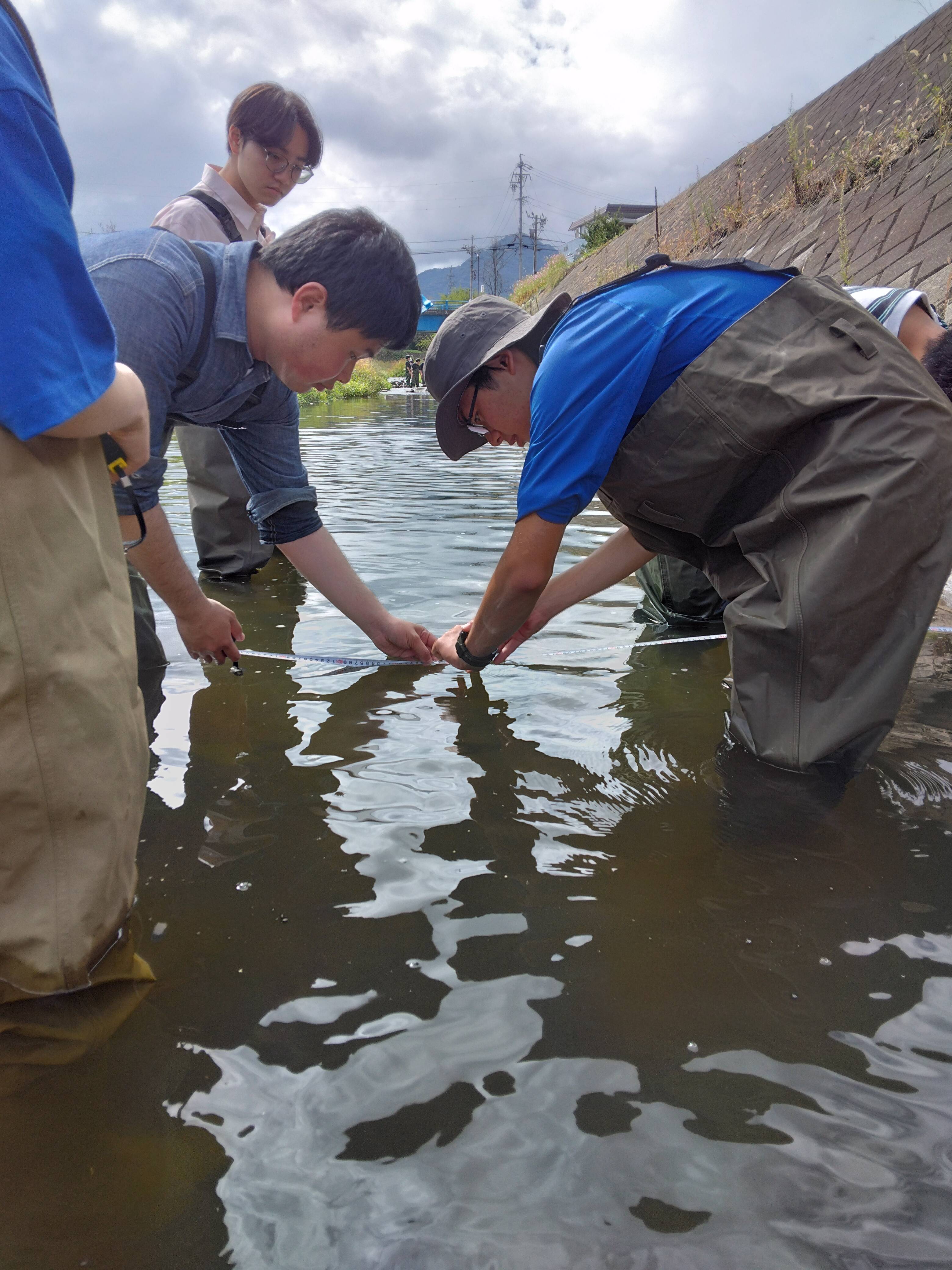環境ツーリズム学部の専門展開科目である自然調査演習の一環として、キャンパス近くを流れる産川へ出かけ、河川の水理条件等について計測を行いました。河川生態系の状態や生物と環境の関係ついて調査・研究を進めていくためには、まず複雑に変化する自然環境を適切に評価する必要があります。受講生たちは水流に足をとられながらも、流速や河床材料などの計測に取り組みました。また、こうした環境評価手法は、河川環境の多様さを多くの人に伝えるための基礎的な技術ともなります。