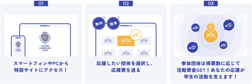 本イベントの特徴は、支援のハードルが低く、誰でも気軽に参加できることです。従来のクラウドファンディングとは異なり、「応援票」を送ることも学生の支援に繋がります。特設サイトを通じて、お手持ちのスマートフォンからその場で投票を行うことができ、1大学につき1団体に投票することが可能です。費用は完全無料です。