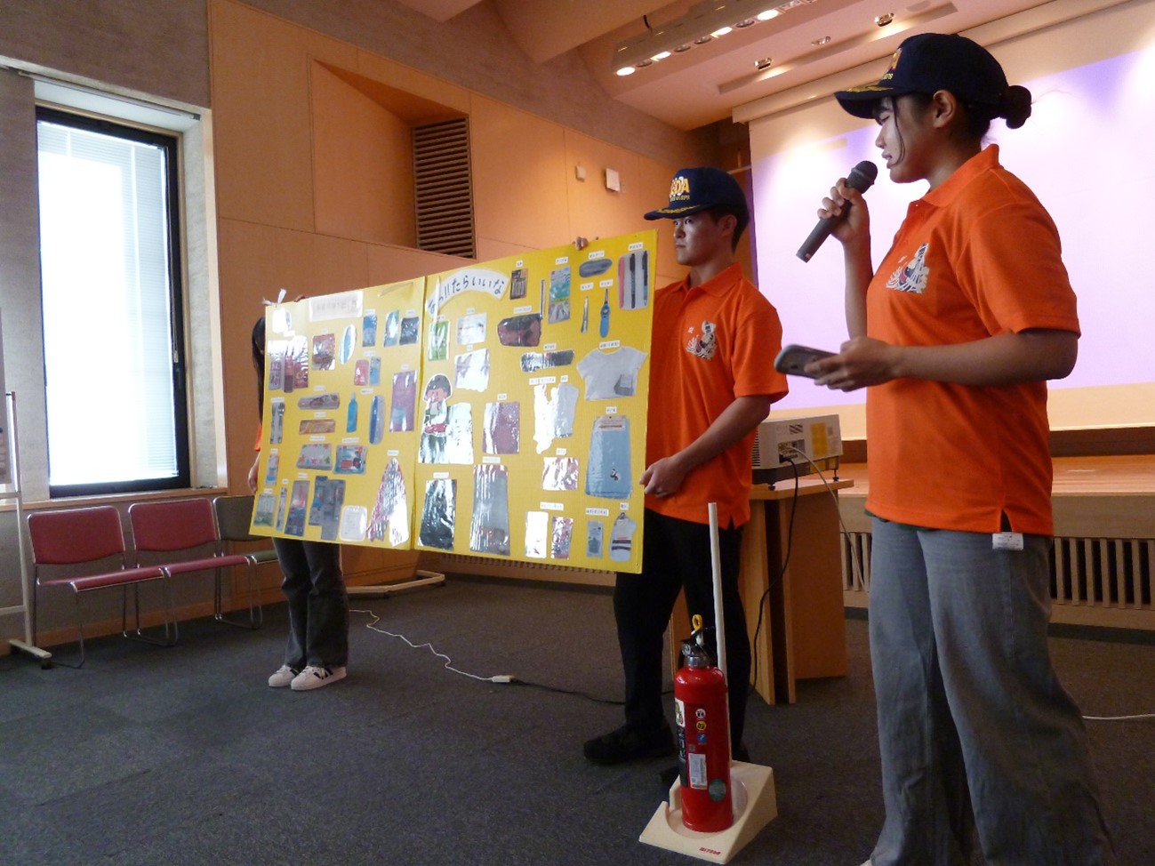 防災用具等について説明する学生消防サークル長野大学分団の学生