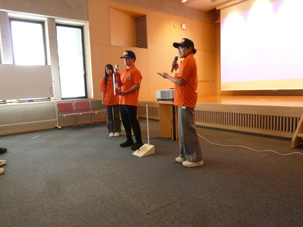 避難後は、ホールに集まり、防災実務研修として、学生消防サークル長野大学分団による消火器の使用説明等や、学外講師による講演を聴きました。学生消防サークル長野大学分団による消火器の使用方法説明では、実際に手順を確認しながら消火活動の基本を学びました。その後、「令和6年度能登半島地震の被災地支援と災害時の危険回避について」と題した講演会を聴講し、防災に関する実務的な知識を深める機会としました。