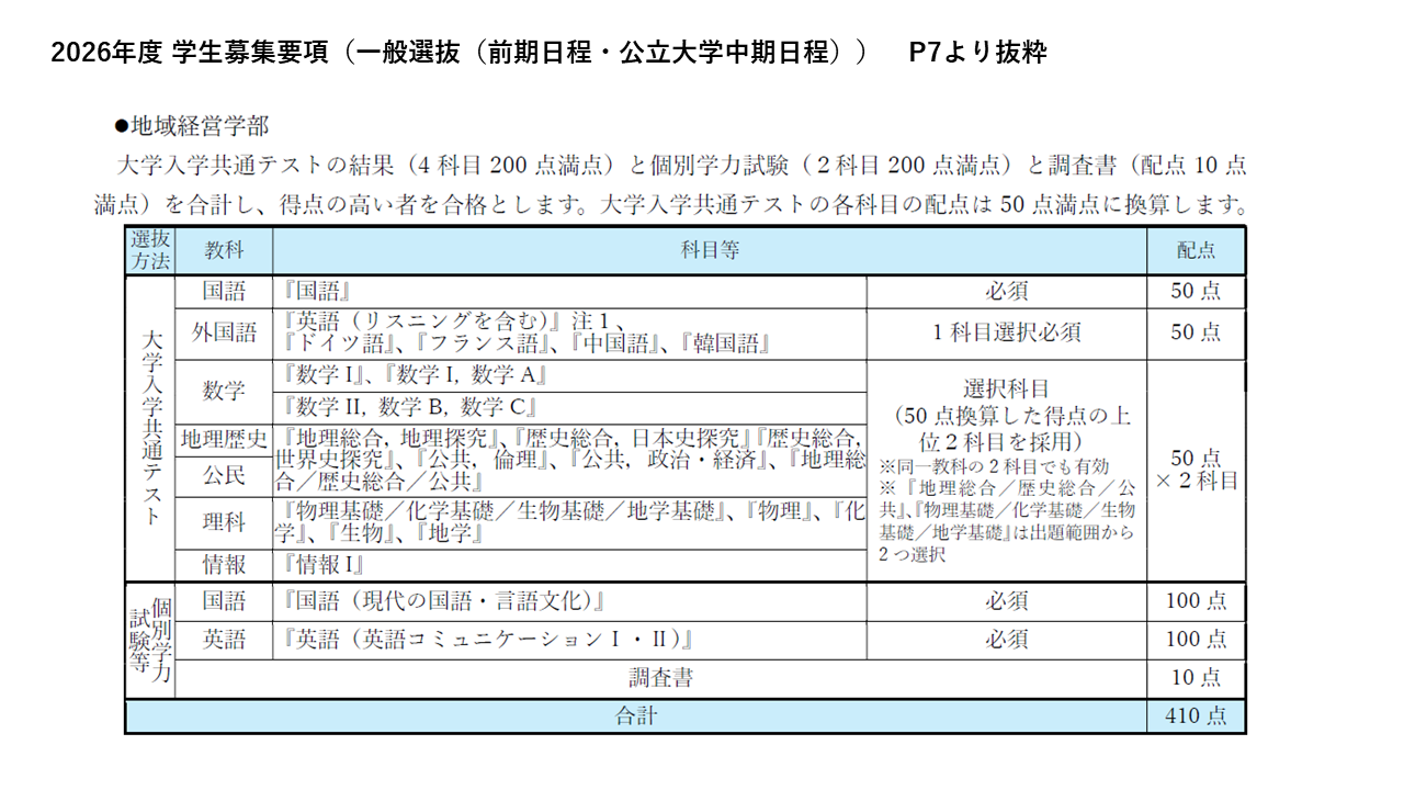 地域経営学部の個別学力試験は、「国語」と「英語」の2教科です。