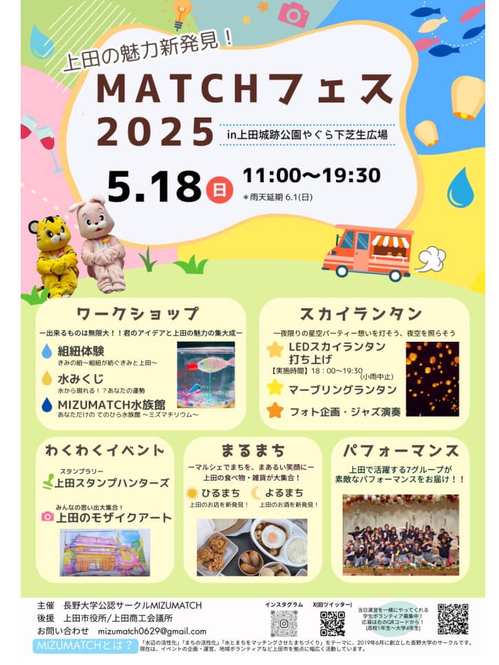 創立後すぐにコロナが発生したため活動が制限されたが、菅平でのスカイランタンを2021年、2022年に行った。そして2023年4月から毎年、上田市城跡公園陸上競技場で「MATCH(まち)フェス」を開催している。2025年5月には、過去2年間の経験を踏まえ、上田の食べ物・雑貨を出店するマルシェエリアには、飲食(15出店)、雑貨(6出店)を配置した。夜には、地元ワインメーカーに来てもらい試飲会も実施した。その他のイベントとしては、上田市の魅力を体験する「ワークショップ」、スタンプラリーでスタンプを組み合わせると上田を象徴する絵がでてくる企画や、皆さんから思い出の写真を提供してもらいそれを貼り合わせて上田城の門を再現するモザイクアートを展示する「わくわくイベント」、多数のランタンで夜空を照らす「LEDスカイランタン」、上田で活躍するグループの活動を紹介する「パフォーマンス」等を企画実行している。